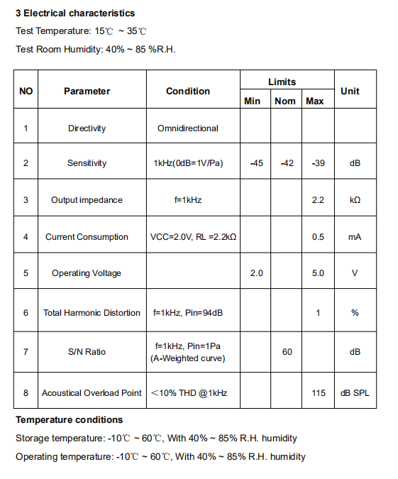 Total Harmonic Distortion: 94dB SPL@1kHz<1%