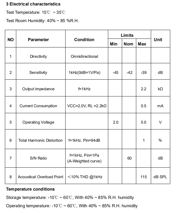 Total Harmonic Distortion: 94dB SPL@1kHz<1%